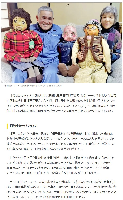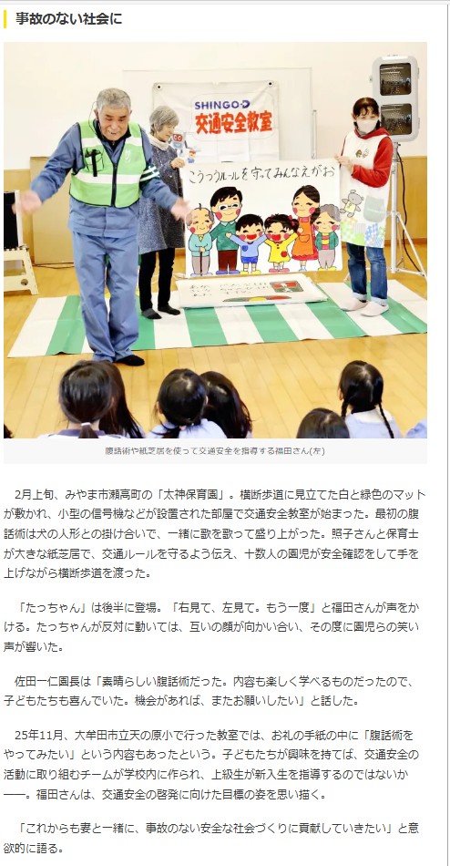 「腹話術で子どもに交通安全を呼び掛け、大牟田夫婦、活動半世紀」